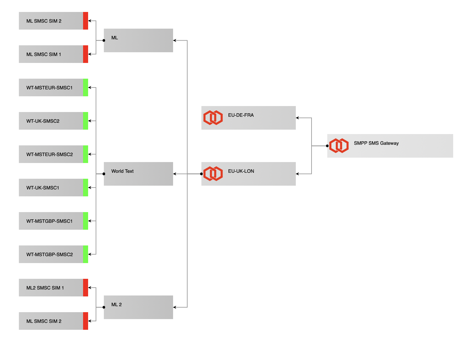 In the Status | SMSCs section you should now see the newly added SMSC in the diagram, connected to the SSG location you selected above. A red or green status on the SMSC’s block shows status of the SMPP bind to that SMSC.