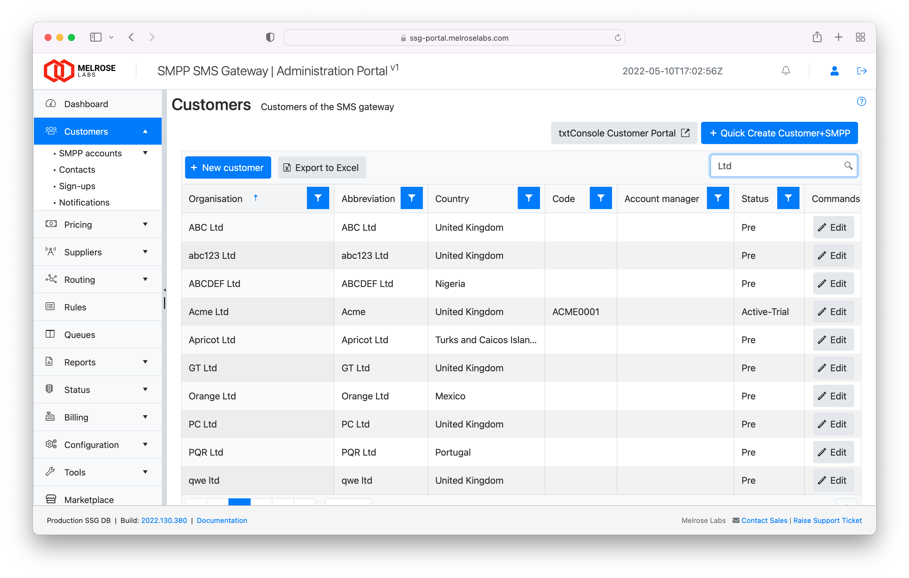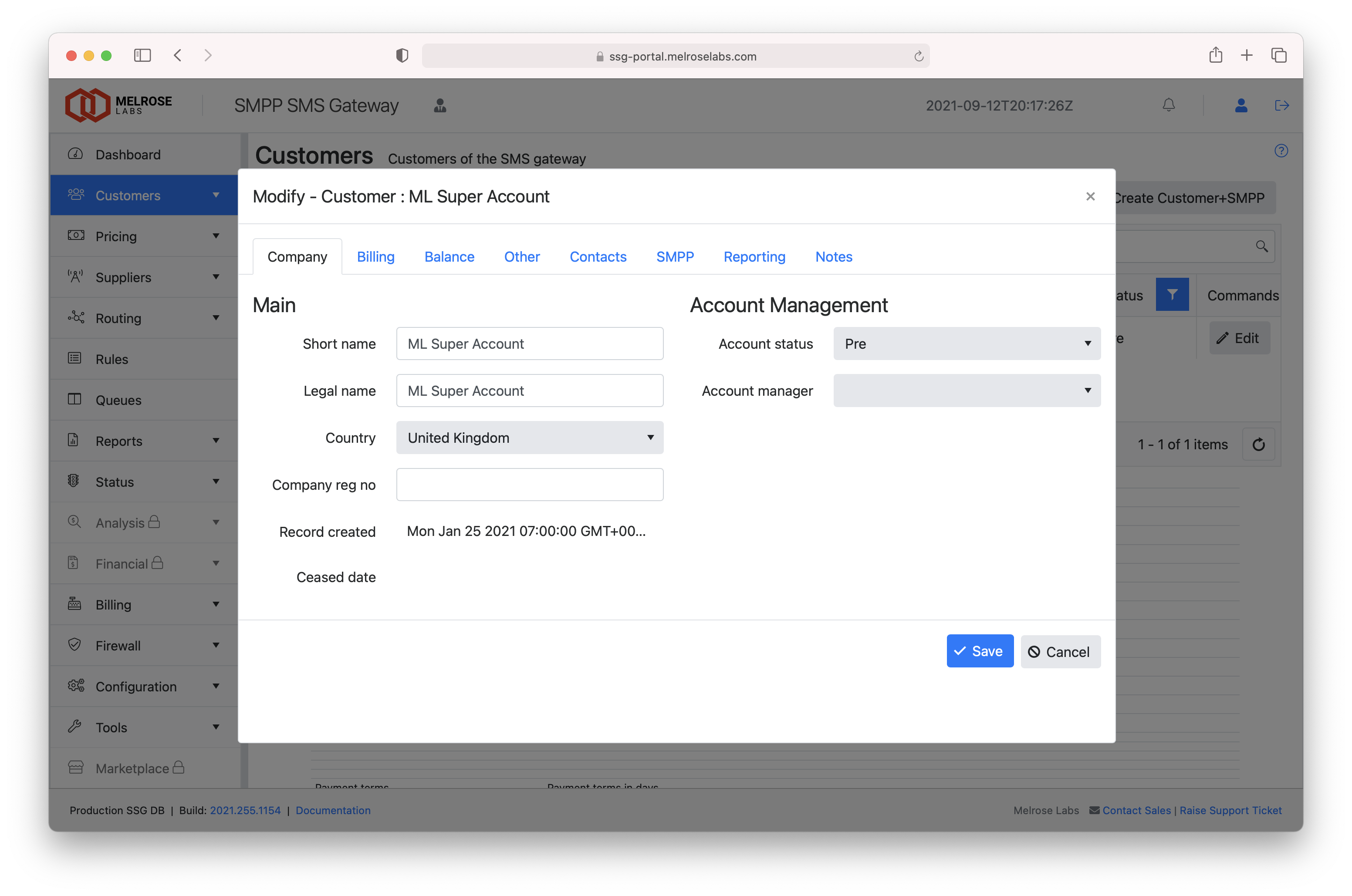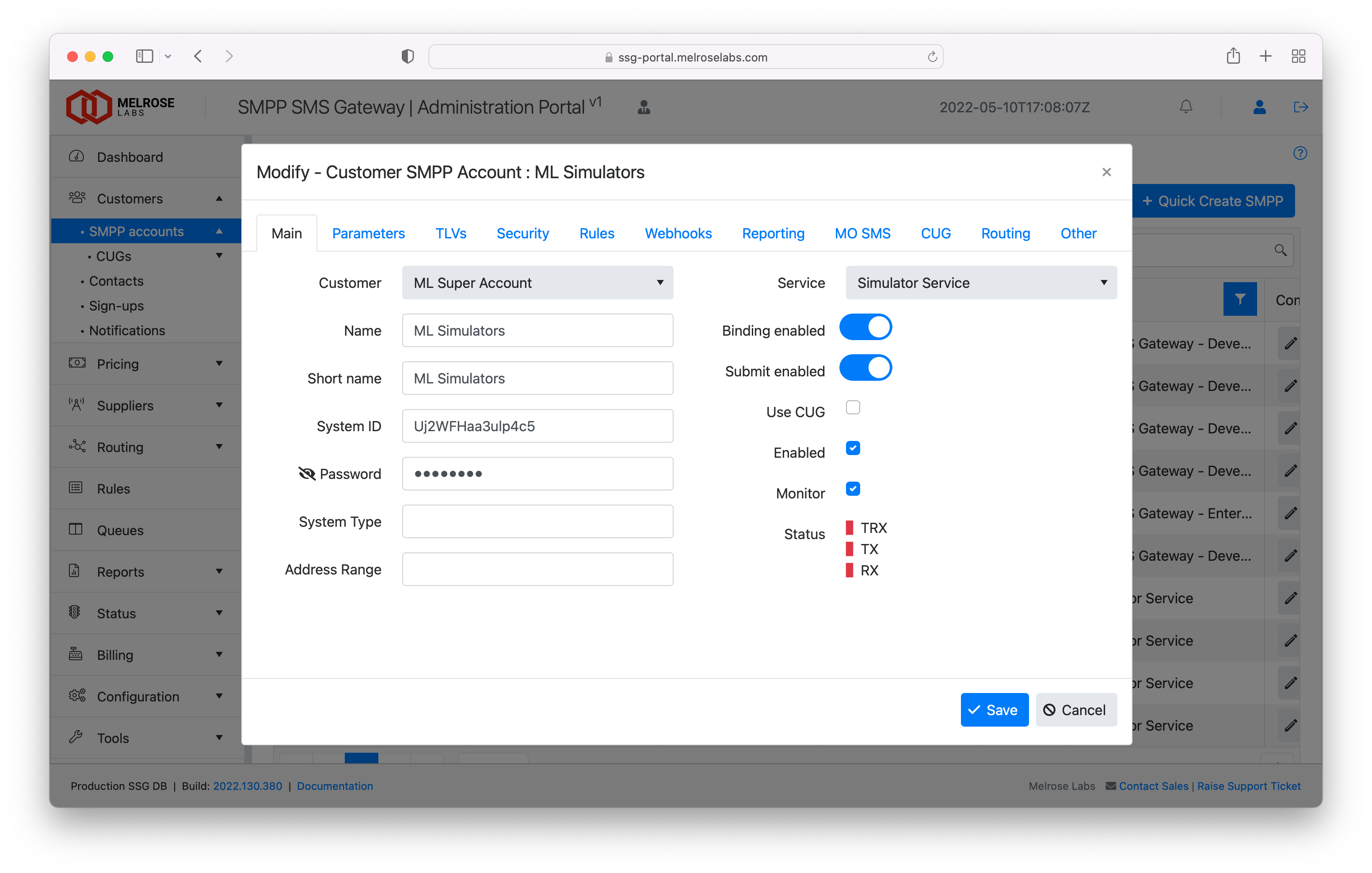 This section contains customer account records and SMPP account details for each customer. Customers can be set-up and managed in this section and new SMPP accounts created.