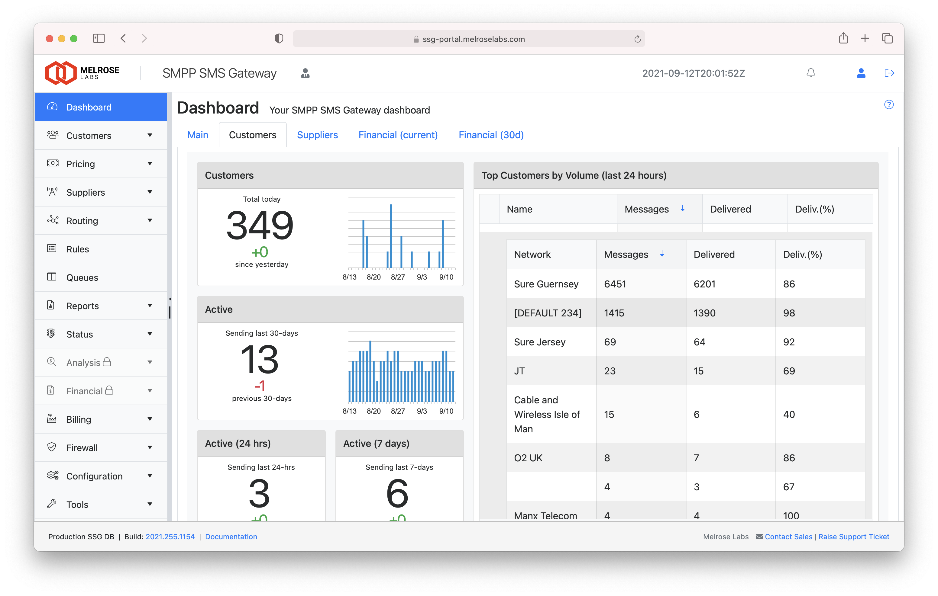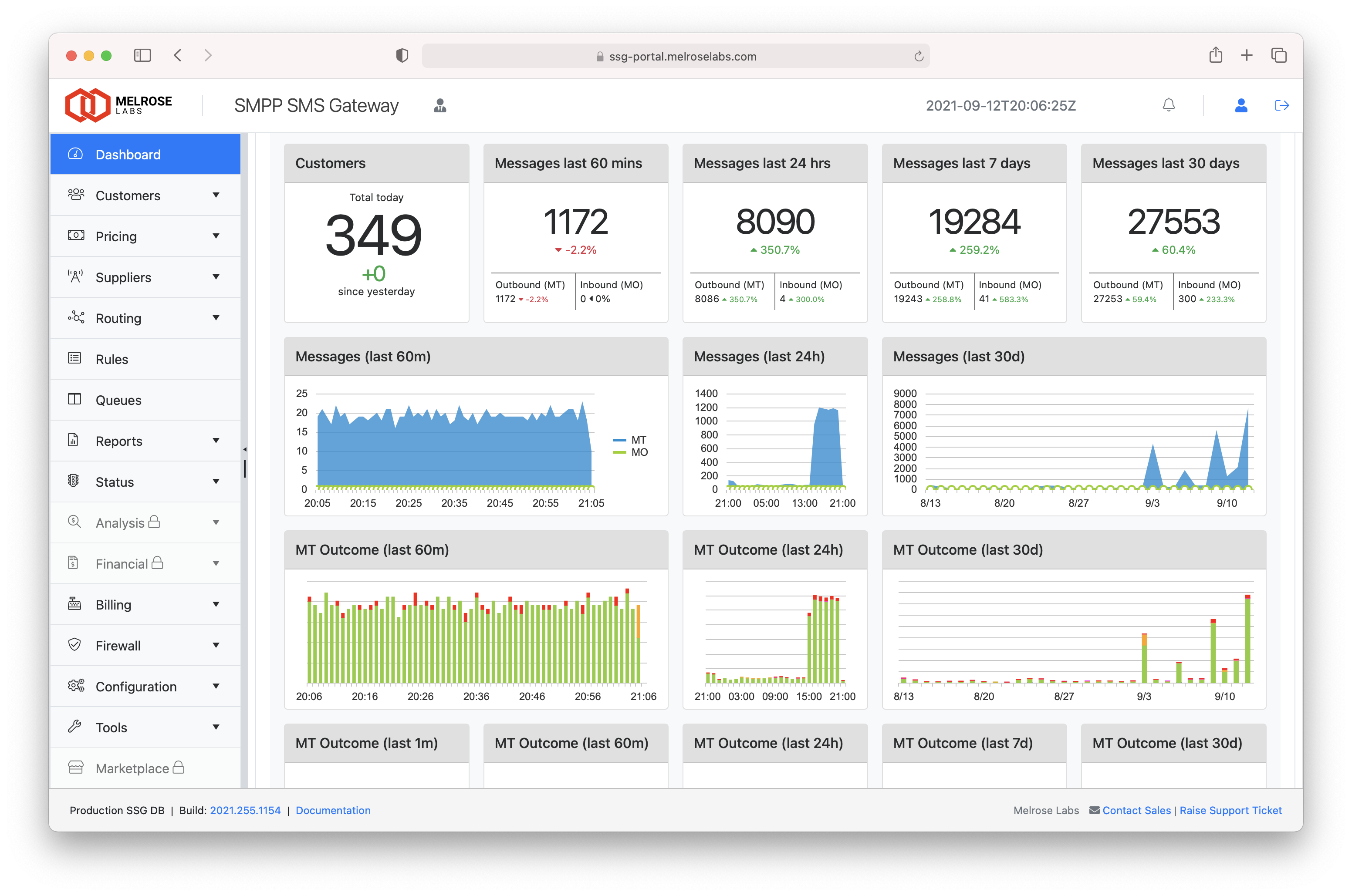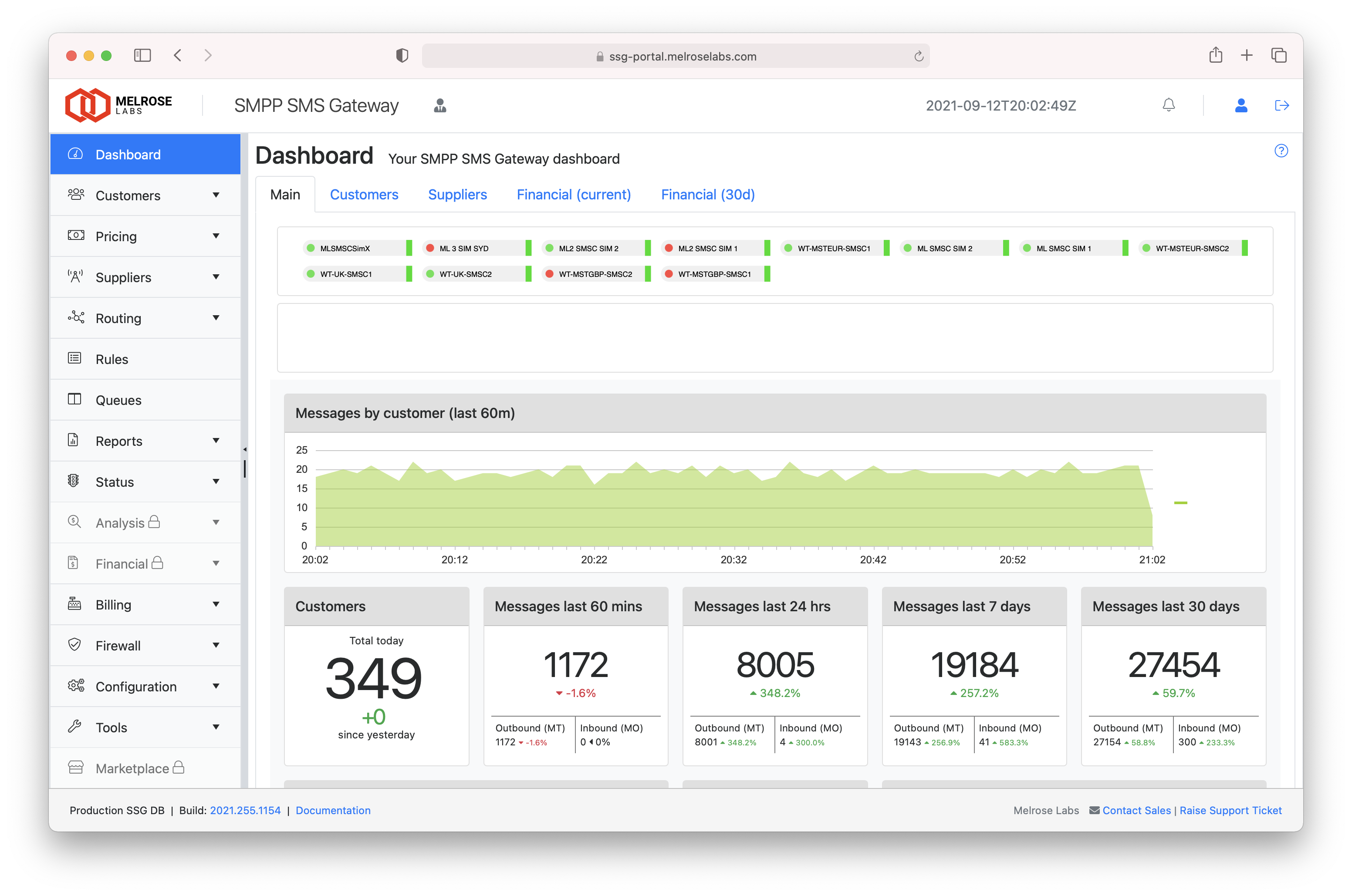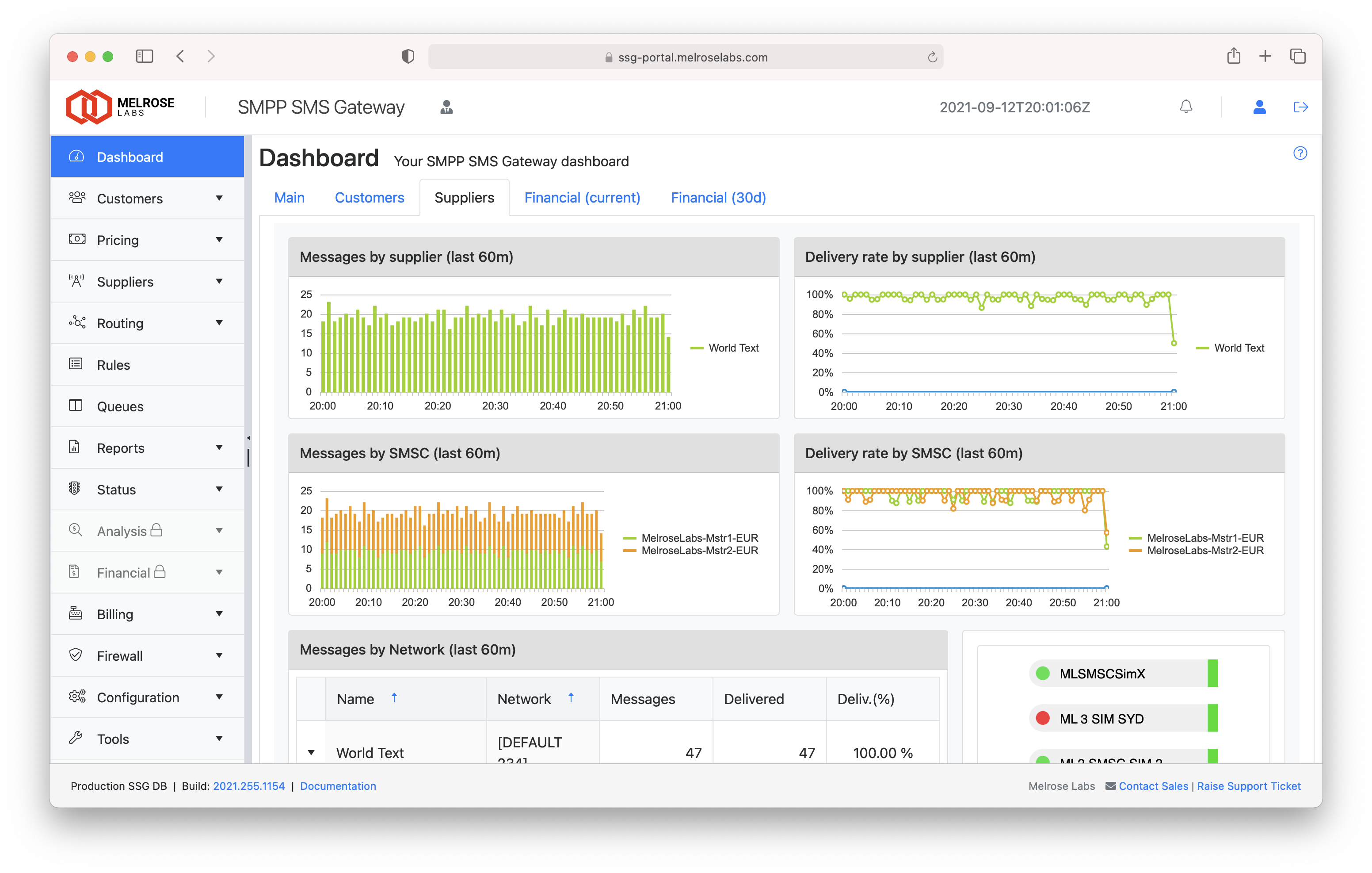 The dashboard shows a high-level view of the SSG instance, covering customers, suppliers and financial information. Supplier SMSC/SMS gateway bind status, traffic levels, traffic outcomes, and customer SMPP account bind status can easily be viewed in the dashboard.