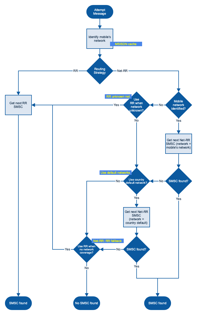 Network Round-Robin (Net-RR) | Messages are distributed across all Net-RR uses the mobile number prefix (NDC) (and optionally See below flowchart for detailed explanation of routing. | A service’s routing profile contains two SMSC groups. The first group has SMSCs A and B, and includes route entries under Messages for United Kingdom | Orange will be equally distributed across SMSCs A and B. Messages for United Kingdom | O2 will be equally distributed across SMSCs A, B, C and D. |
