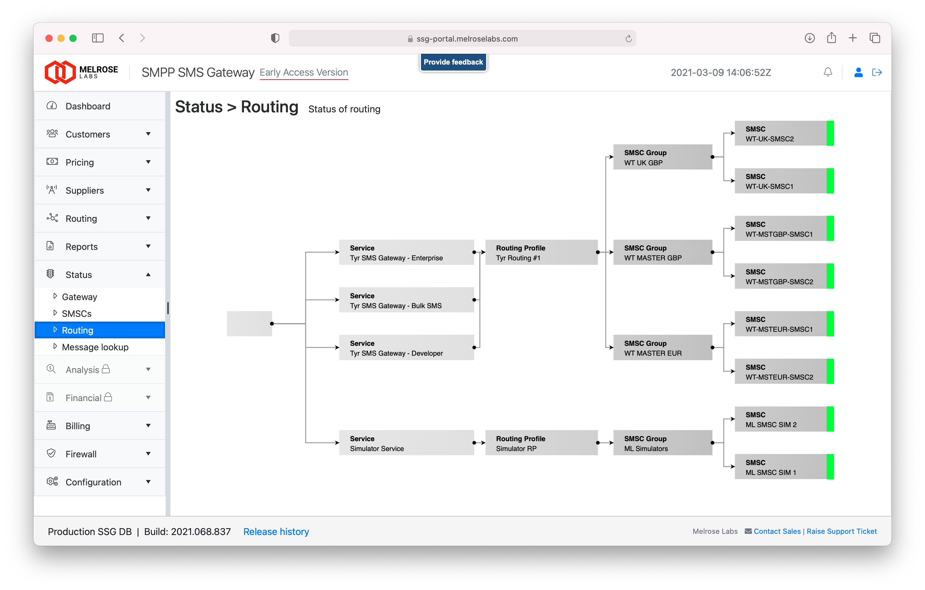 A digram showing the current routing configuration and status of SMSC connections can be viewed in the Status | Routing section.