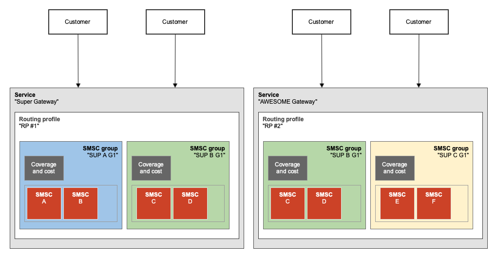 A service’s routing profile contains one or more groupings of SMSCs. Each grouping of SMSCs is defined in an SMSC group. These SMSC groups are normally used to group together one or more SMSC accounts from an individual supplier and that belong to a specific service from that supplier.
