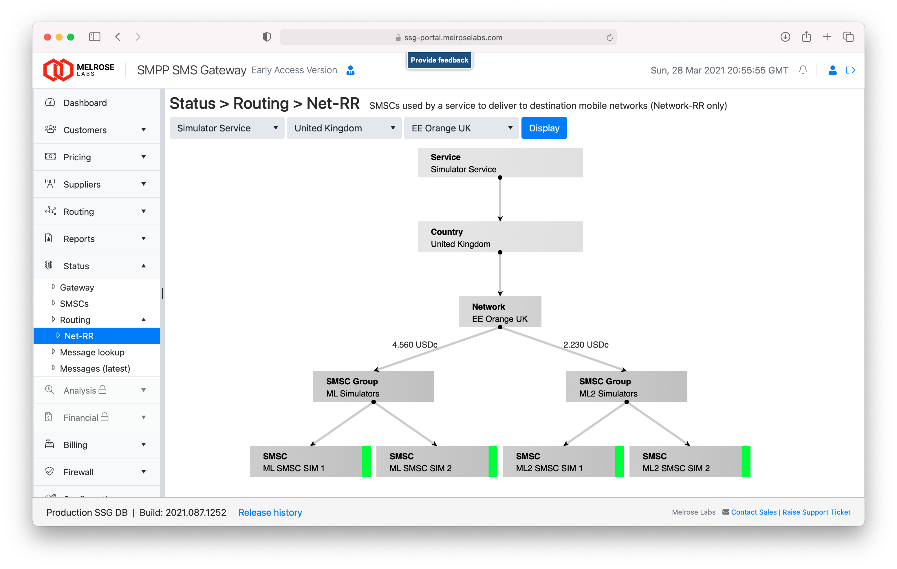 For Net-RR routing, SMSC selection for a particular network can be viewed in the Status | Routing | Net-RR section.